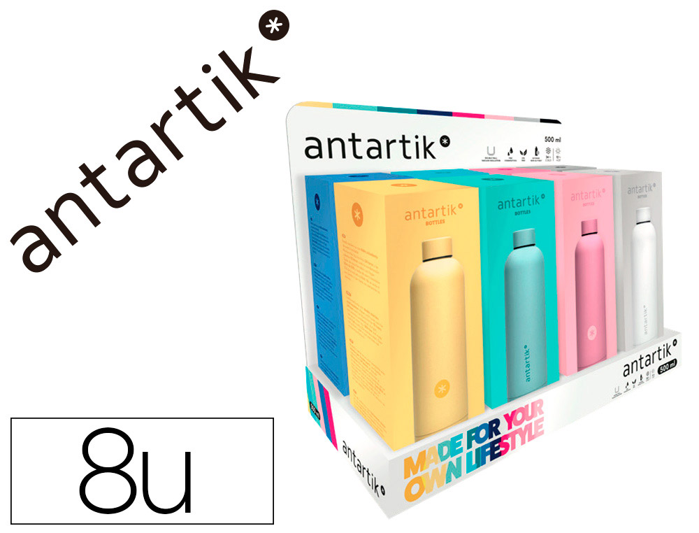 Botella antartik isotermica acero inoxidable libre de bpa 500ml expositor con 8 botellas